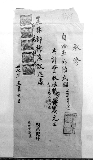 展出的发票,有的比A4纸稍小,有的巴掌大,都是毛笔手写,盖有印章。有买纸张的,一张1947年的老发票上写着:道林纸便条100本,共计法币170万。还有买树的,宝塔松4株共计法币6000元整;就连修自行车也有发票:承修,自由车外胎两个,实收法币5万元整。