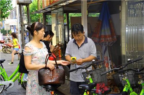 “龙师傅,还车!”一位在附近上班的市民车还没到,声音已经到了。因为工作时间比较久,大部分在这里租车的市民都认识了龙师傅。随后,龙毅夫拿出他的工具—自行车租赁系统操作器,对着自行车的锁头扫描一下,确认车子的使用时间,随后拿起市民的租赁卡,确认市民自行车已还。