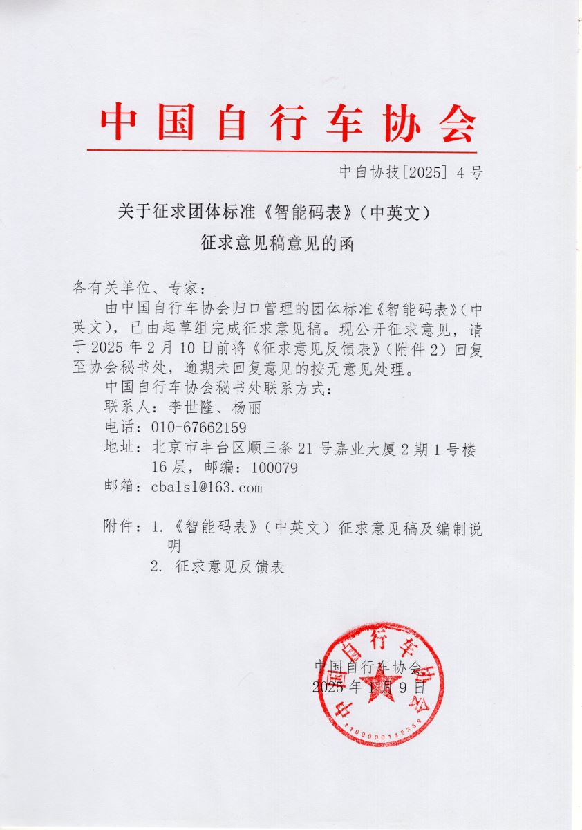 关于征求团体标准《智能码表》(中英文)征求意见稿意见的函 来源:中自协 作者: 发布时间:2025-01-09 09:31 附件:1.1《智能码表》(中英文)征求意见稿 1.2《智能码表》编制说明 2. 征求意见反馈表