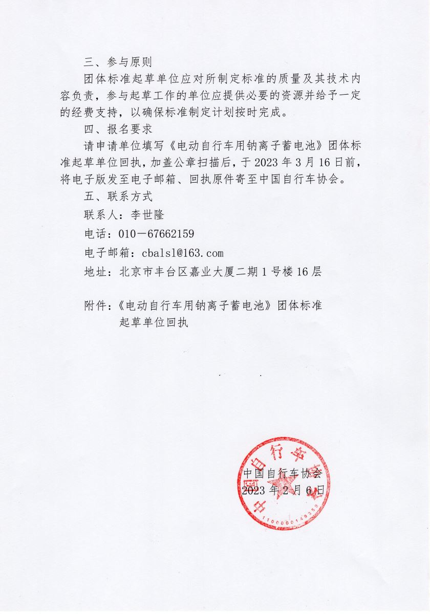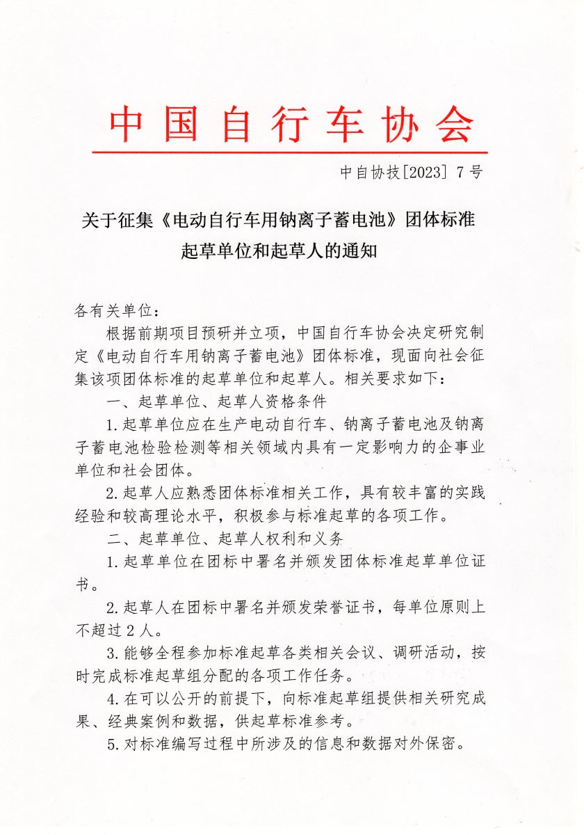 关于征集《电动自行车用钠离子蓄电池》团体标准起草单位和起草人的通知