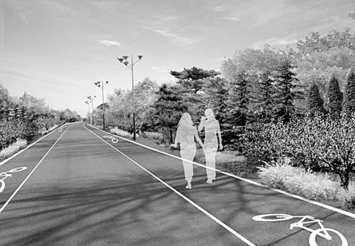 另外,在景观带土坝外设计一条以跑步健身为功能的游览路线,道路路面以塑胶为路面,宽3米,总长5.2公里,沿线布置多个小健身广场。慢跑道将蜿蜒穿梭于茂密的生态林中。