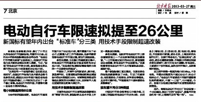 余世光透露,正在修订的最新意见稿中,把电动自行车的最高设计速度拟定为26公里/小时,“这是我们根据实际调查确定出来的一个比较安全的速度”。