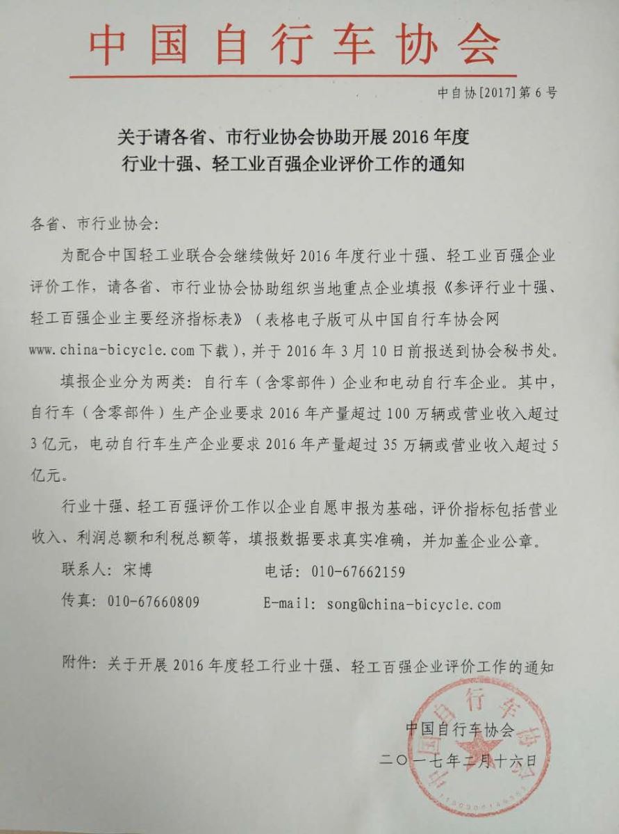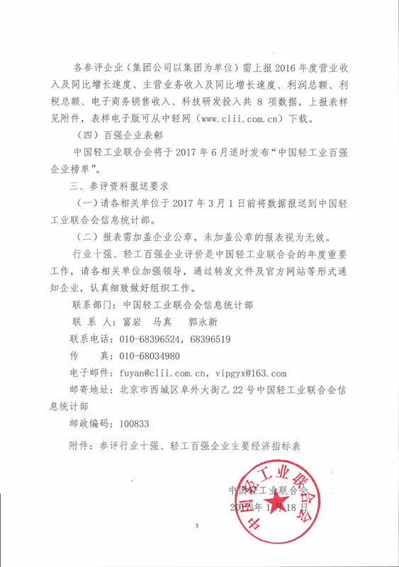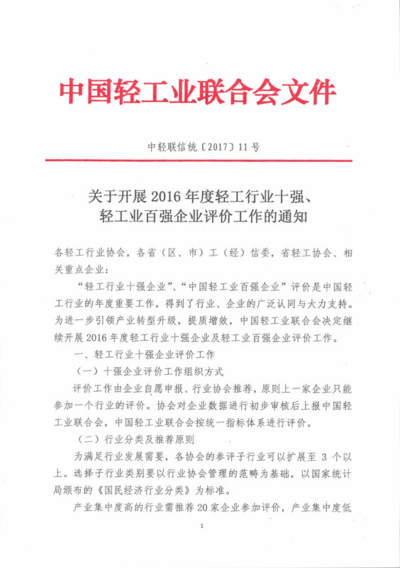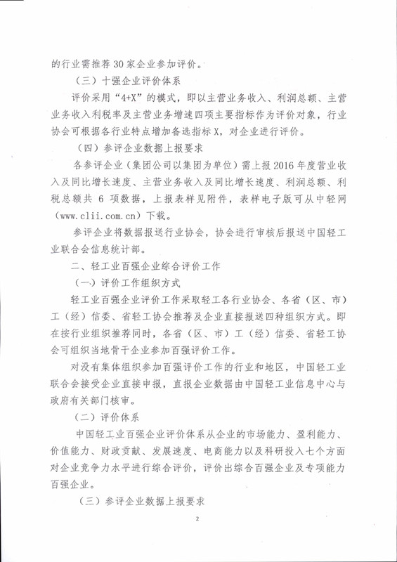 2016年度行业十强、轻工业百强企业评价工作的通知