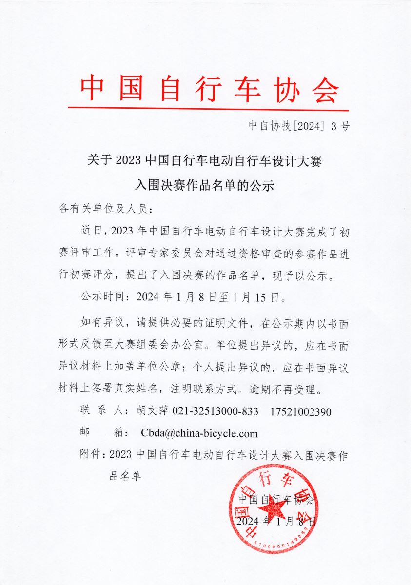 关于2023中国自行车电动自行车设计大赛入围决赛作品名单的公示