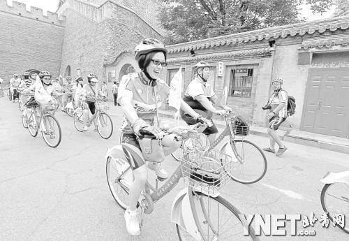 7月22日上午,北京市交通委员会牵头举办公共自行车运行一周年纪念活动,30名来自香港的学生和10名贫困地区学生作为志愿者,骑行北京体验胡同文化。市交通委表示,今年底北京的公租自行车将达到2.5万辆,站点超过600个。