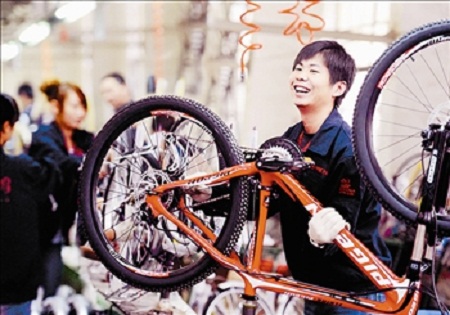 “飞鸽”员工正在组装碳纤维超轻自行车