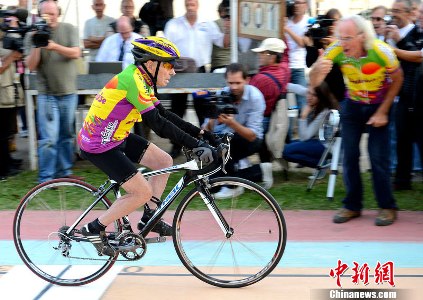 当地时间2012年9月28日,法国里昂,法国百岁老人罗贝尔-马尔尚打破百岁老人骑自行车100公里的最快纪录。