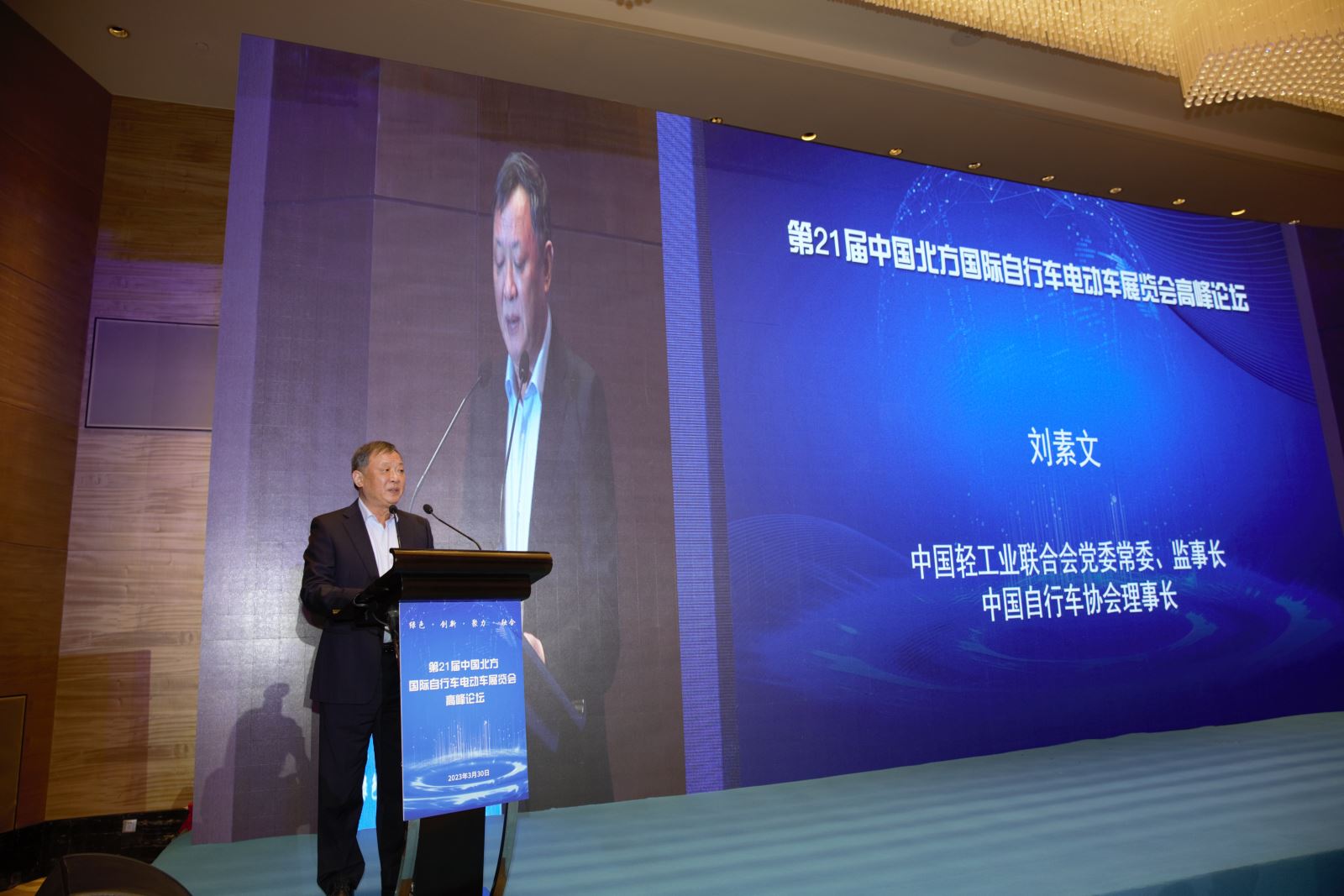 3月30日,刘素文理事长出席了由天津市自行车电动车行业协会主办的第21届中国北方国际自行车电动车展览会高峰论坛并作主旨演讲。他表示,本届论坛主题是“绿色、创新、聚力、融合”,这四组词汇传递出的核心要义其实就是——科技创新,无论推动绿色低碳发展,还是聚合多方资源与力量,或者促进行业上下游产业链融合发展,能打通个中关节、实现良性衔接互动的,唯有科技创新。刘理事长重点就行业科技创新的使命、路径、任务和关键核心谈了四点想法。