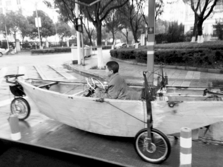 象山出现海陆两栖电动车 来源:中国宁波网 作者:戴巧泽 发布时间:2013-01-14 15:39 1月10日,有网友在象山港路广电楼下红绿灯附近发现一辆特殊的“电动车”。据悉,这辆车以船为模型,前后共安装了3个轮子,看上去像是水陆两栖的。它穿梭在街头引起路人的围观。 据了解,有细心的网友发现,这辆车经常出现在象山爵溪,据说这是当地一家废品收购站老板改装的。虽然看着很拉风,交通安全可不能忘。 摘编:admin; 摘编日期:2013年1月12日