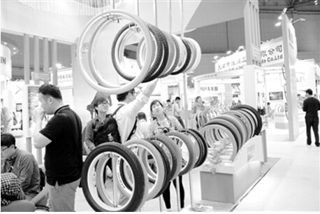在第二十五届中国国际自行车展览会上,观众参观不同型号的自行车车胎。经济日报记者 杨开新摄