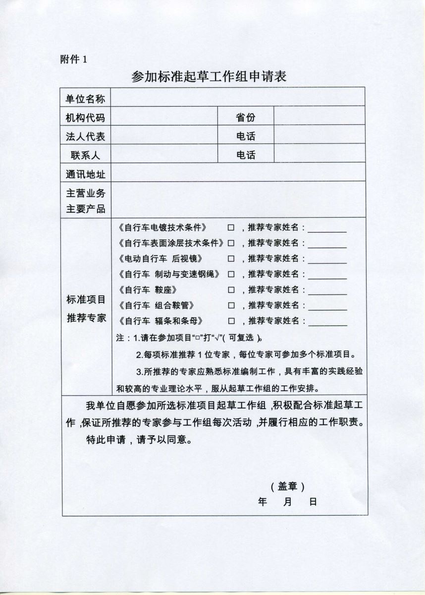 关于征集《电动自行车 后视镜》等七项行业标准制修订起草工作组成员单位的通知 来源:中自协 作者:技术标准部 发布时间:2020-08-21 14:30 附件:申请表 摘编:中自协; 摘编日期:2020-8-21