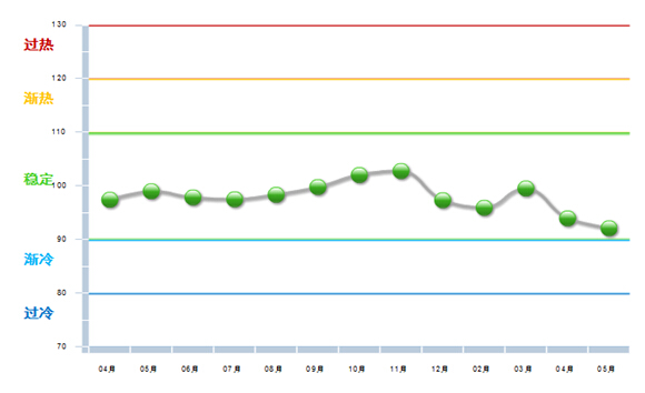 根据中国轻工业信息中心和taptapios官网下载联合发布2015年5月份中轻自行车景气指数。5月份中轻自行车景气指数94.12,其中:主营业务收入景气指数为95.46,出口景气指数为90.99,资产景气指数为92.66,利润景气指数为92.08(参见图1)。