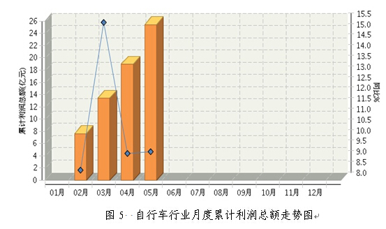 1-5月份,全国自行车制造行业累计完成利润总额25.44亿元,同比增长9.34%(参见图5)。
