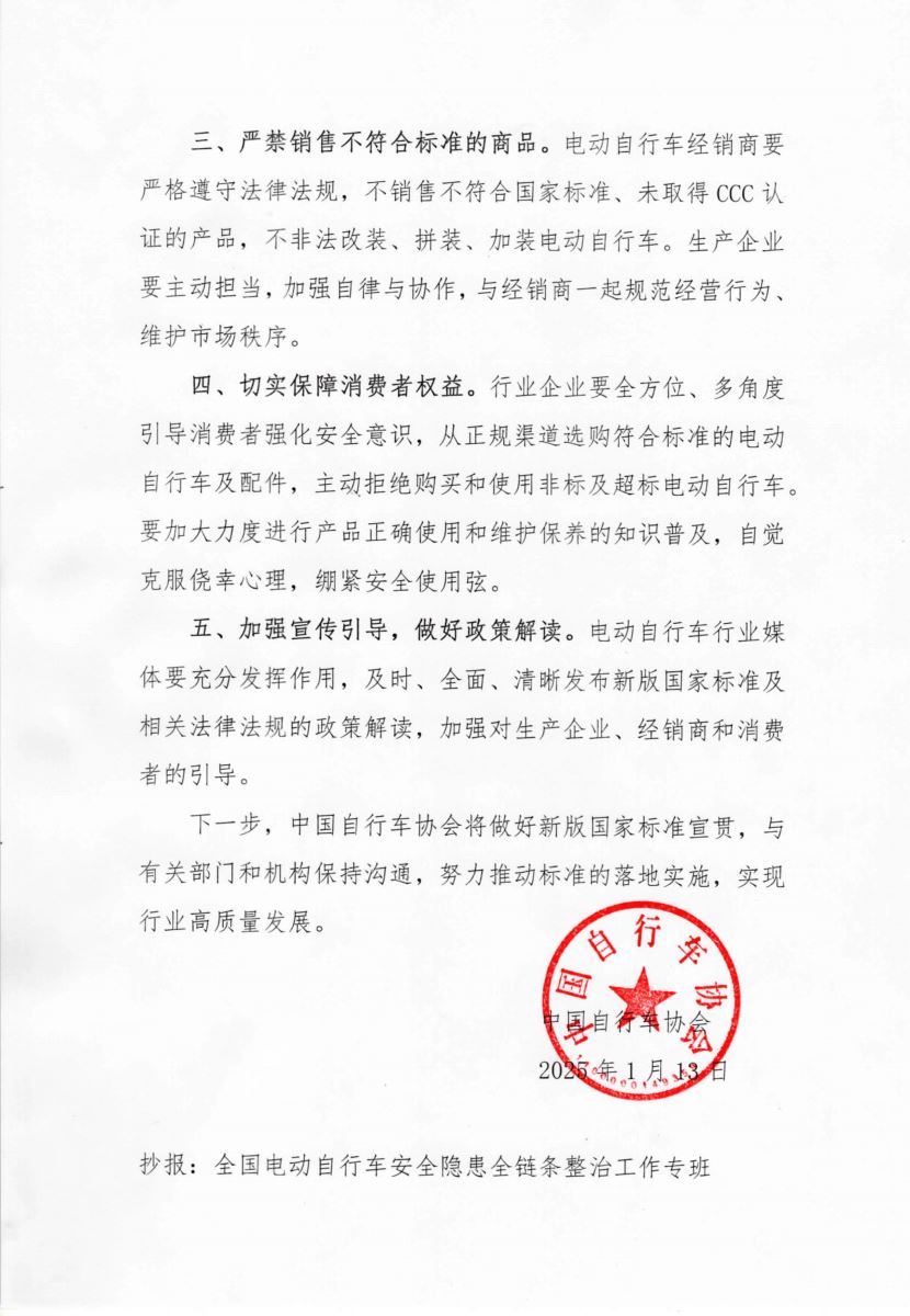 四、切实保障消费者权益。行业企业要全方位、多角度引导消费者强化安全意识,从正规渠道选购符合标准的电动自行车及配件,主动拒绝购买和使用非标及超标电动自行车。要加大力度进行产品正确使用和维护保养的知识普及,自觉克服侥幸心理,绷紧安全使用弦。