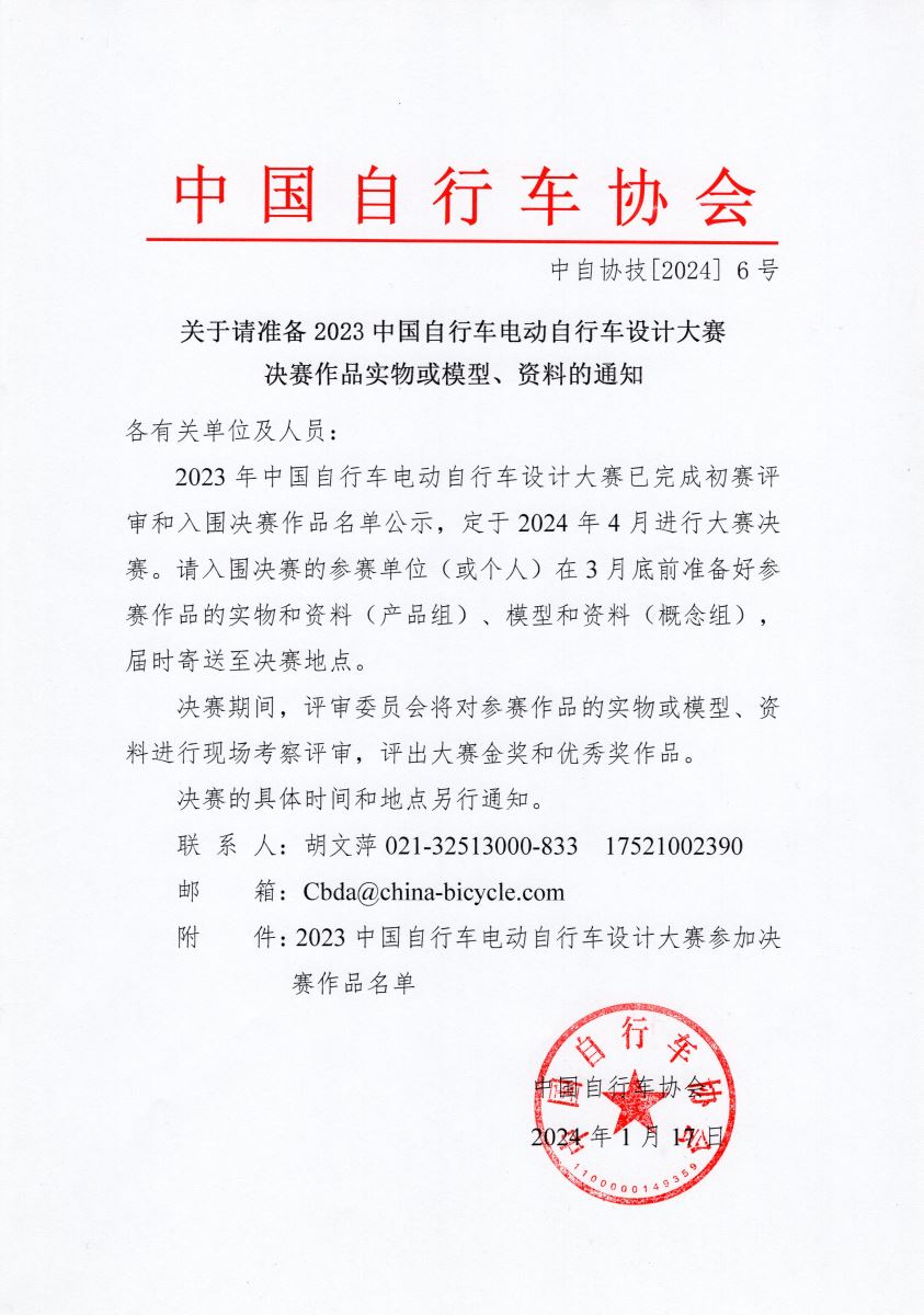 关于请准备2023中国自行车电动自行车设计大赛决赛作品实物或模型、资料的通知 来源:中自协 作者: 发布时间:2024-01-17 14:23 附件:2023中国自行车电动自行车设计大赛参加决赛作品名单