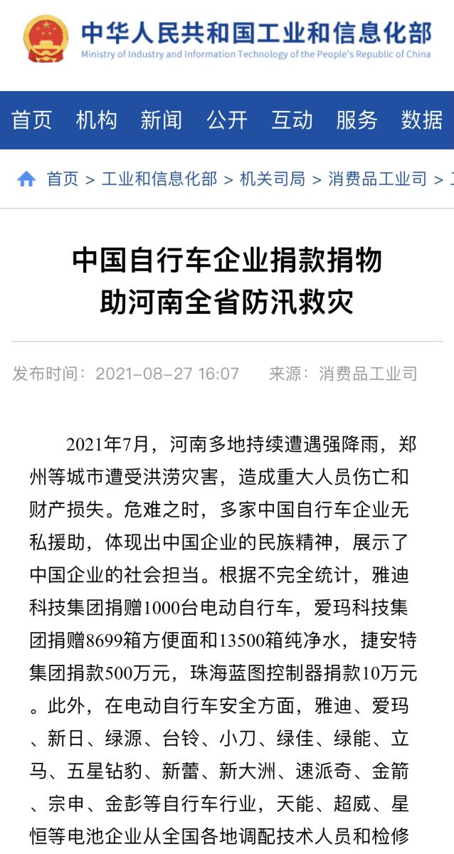 工信部为中国自行车行业助力河南防汛救灾点赞