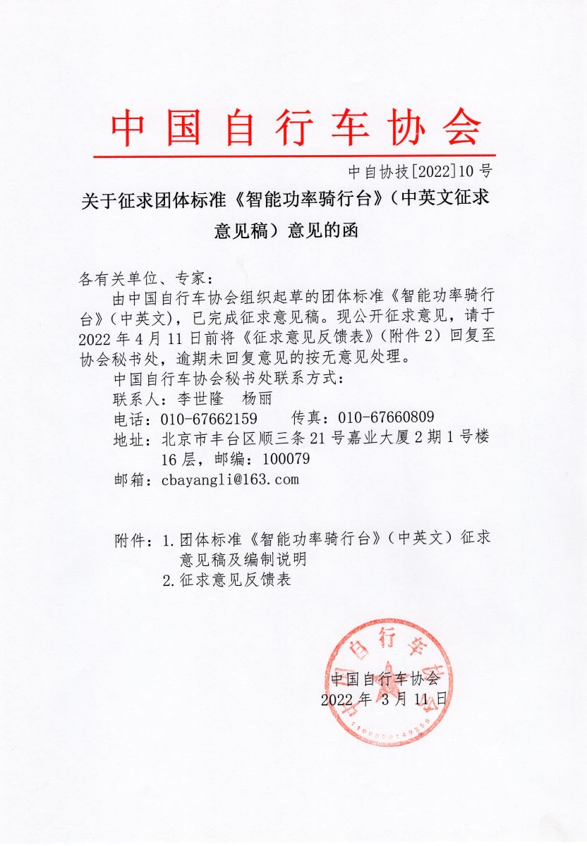 关于征求团体标准《智能功率骑行台》(中英文征求意见稿)意见的函