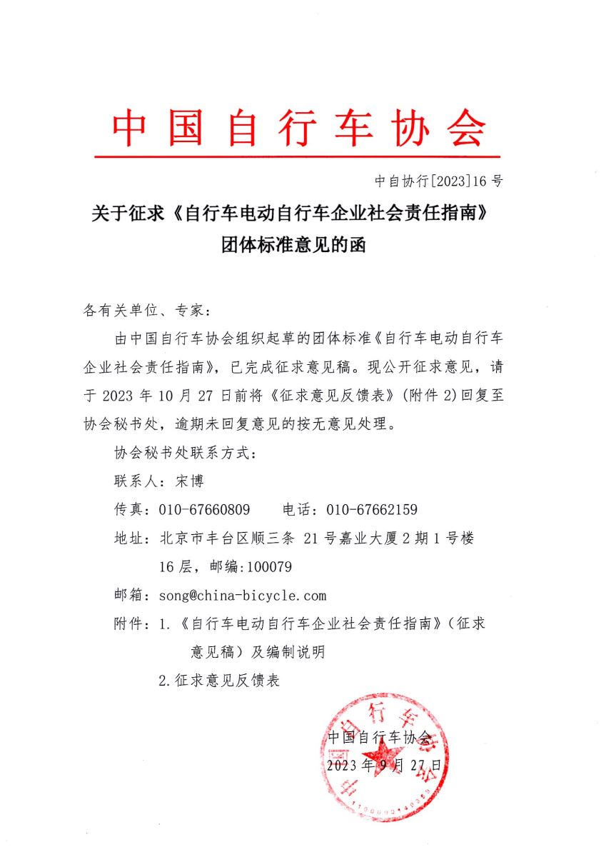 关于征求《自行车电动自行车企业社会责任指南》团体标准意见的函 来源:中自协 作者:行业发展部 发布时间:2023-09-27 13:52 附件:1.1、《自行车电动自行车社会责任指南》(征求意见稿) 1.2、《自行车电动自行车企业社会责任指南》(征求意见稿)编制说明 2、征求意见反馈表