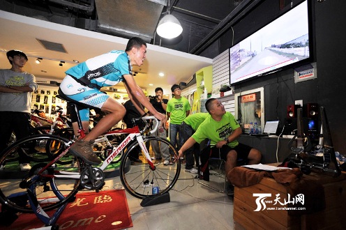 9月9日上午,窗外的雨淅淅沥沥地下着,乌鲁木齐市美利达自行车形象店内却热闹非凡:加油声、掌声和车轮转动声响混合在一起。这是新疆首届自行车室内骑行台挑战赛的比赛现场,观看这一新奇赛事的自行车爱好者将现场围得严严实实。