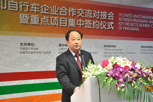 平乡县县委书记杨宪春、县长贾芳分别就平乡的基本情况、自行车产业优势、园区建设、招商引资优惠政策等一一作了介绍,诚邀各地客商到平乡参观考察、投资置业、共谋发展。在随后举行的项目集中签约仪式上,中印自行车产业园、大行高档折叠车生产扩建、捷马自行车平乡生产基地、常州永轮车业山地车鞍座生产等8个自行车项目,中国邢台3D数字技术创意产业园、平乡县内陆港大型综合物流产业园等6个产业化项目顺利签约,协议总额达170亿元。