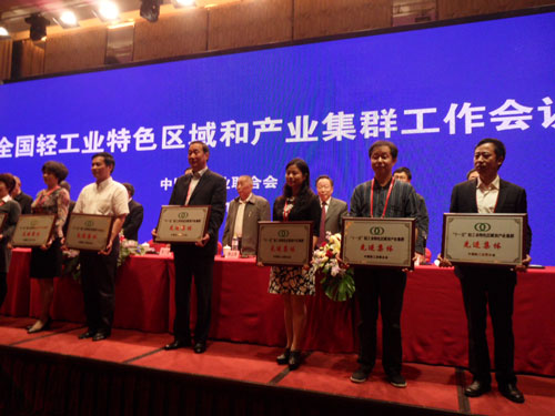 (右一为江苏省太仓市人民政府代表领取全国轻工特色区域和产业集群先进集体称号奖牌)