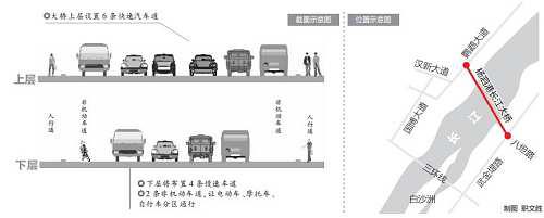 按设计,大桥上层设置6条快速汽车道,下层将布置4条慢速车道。近期考虑到市民过江需求,将设置2条非机动车道,让电动车、摩托车、自行车分区通行。远期,若非机动车减少,下层也可改为6条机动车道。上下两层均有人行道,供市民观光、游览、慢跑。