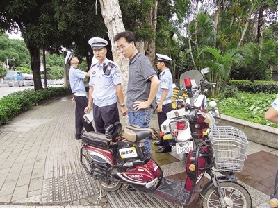 南宁交警现场对逆行的电动车主进行了处罚教育