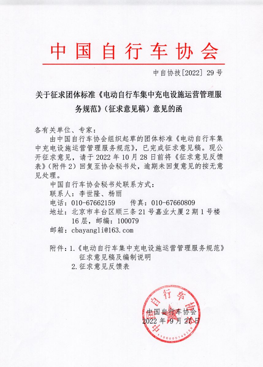 关于征求团体标准《电动自行车集中充电设施运营管理服务规范》(征求意见稿)意见的函