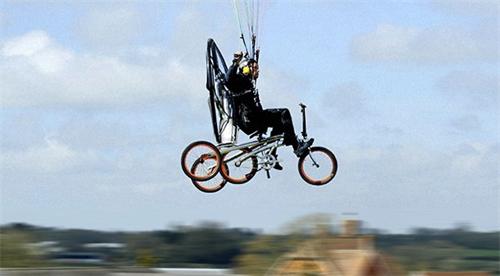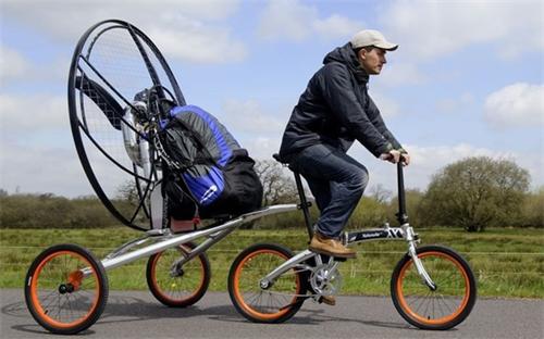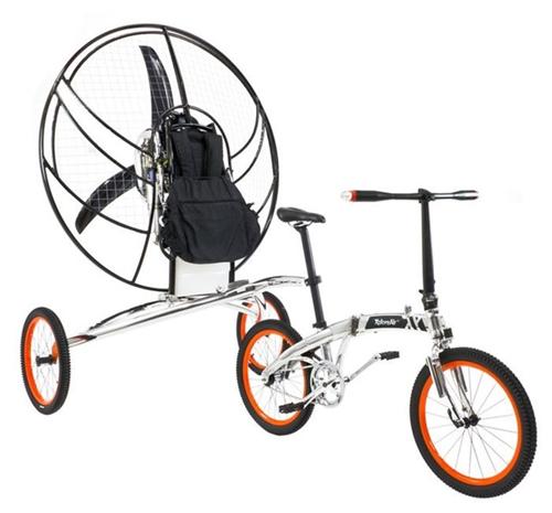 这款名叫Paravelo的自行车由英国设计师约翰-福尔顿(John Fordon)和亚尼克-雷德(Yannick Read)设计,目前正在kickstarter众筹中。这款设备由一个小型自行车+装载了燃料风扇的半挂车+一个降落伞组成,在任意开放场地,打开飞行自行车的马达,风扇转动,鼓起降落伞充当翅膀,自行车逐渐起飞。