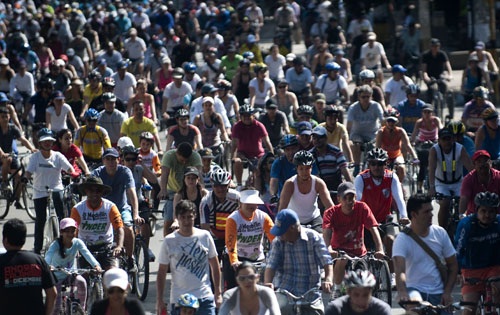 6月2日,在哥伦比亚安蒂奥基亚省麦德林市,参加“自行车日”活动的人们在街道上骑行。