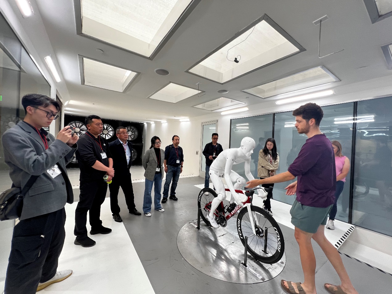 闪电自行车有限公司创办于1974年,是目前全球最顶尖的自行车品牌之一。美国当地时间4月18日,青委会一行来到位于加利福尼亚州摩根山(morgan hill)的闪电公司总部,闪电公司市场部门负责人Ria带领大家先后参观了风洞实验室、自行车水壶设计生产车间、创新研发实验室、检测和机械设备实验室、闪电历史及概念产品展示厅等。