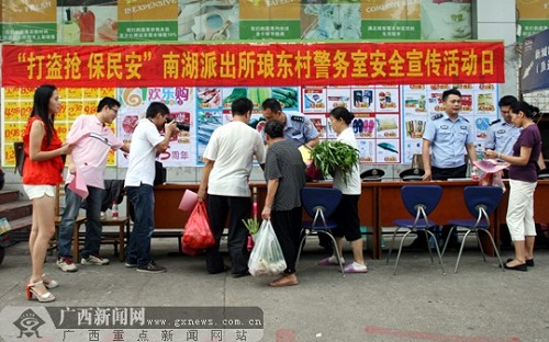 为切实增强社区广大居民的安全防范意识,5月22日上午南宁市公安局南湖分局民警深入社区,向辖区居民开展电动自行车防盗宣传活动。