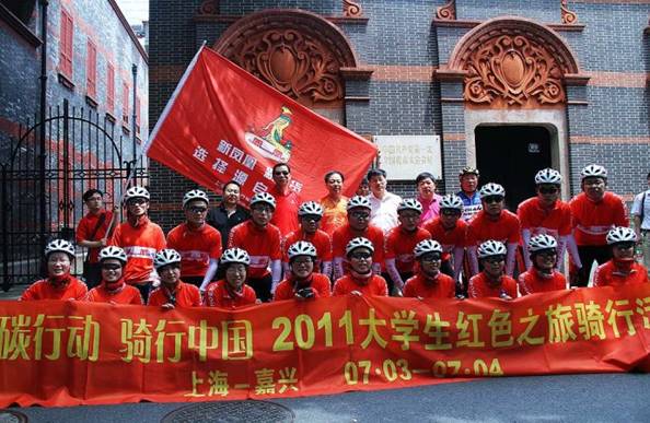 这是一处朴素的上海石库门民居,青砖黛瓦镶嵌西洋雕花,配着沉甸甸的乌漆大门,历经90载风雨沧桑,愈发显出历史的厚重。90年前,在这扇大门后的狭小厅堂,中国共产党人点燃第一簇革命星火。随后不久,在嘉兴南湖之上,中国共产党人的“红船”正式起航。90年后,同样是在上海,“低碳行动 骑行中国”2011大学生红色之旅骑行活动胜利举行,骑行队来到一大会址,来到嘉兴南湖去感受那段激情燃烧的岁月。