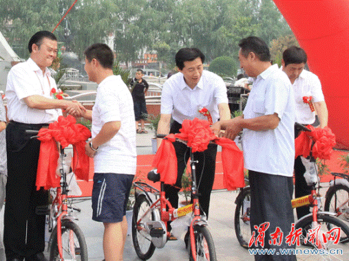 倡导低碳排放、提高全民环保意识。713,中国红十字基金会仁爱基金志愿者工作办向大荔县捐赠1000辆自行车仪式在大荔同州广场举行。捐赠仪式上,中国红十字基金会仁爱基金志愿者工作办主任时进龙(左一)等领导向工作在基层的大荔县城管监察人员、环卫协调员、卫生系统基层工作人员和乡村医生及教育系统教师代表现场发放了100辆自行车,大荔县委、县政府向志愿者赠送了“仁爱无限,情满同州”的牌匾。