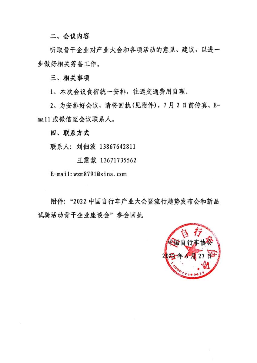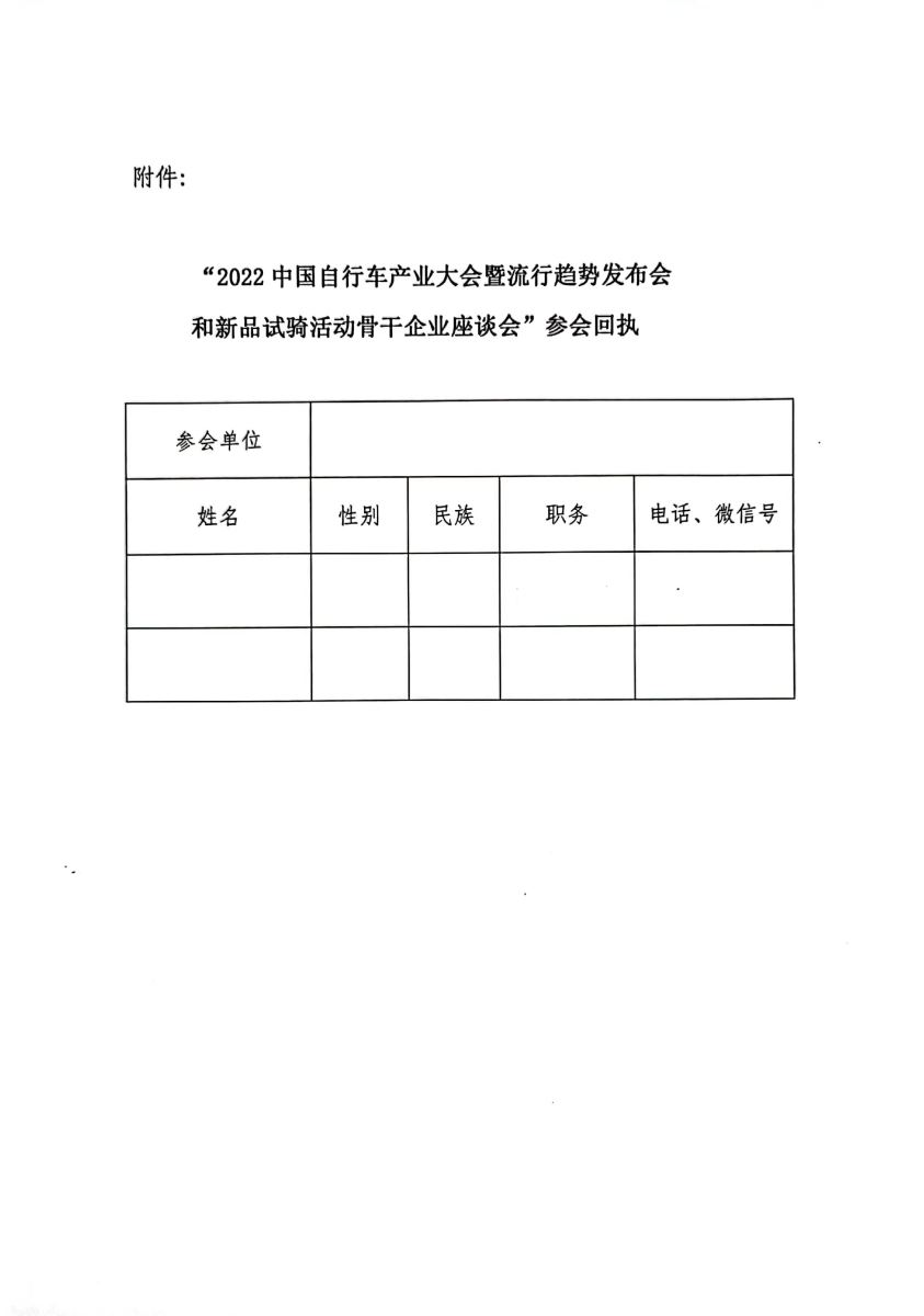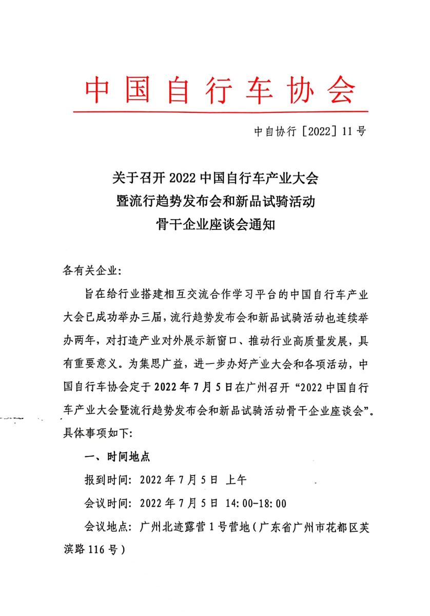 关于召开2022中国自行车产业大会暨流行趋势发布会和新品试骑活动骨干企业座谈会通知
