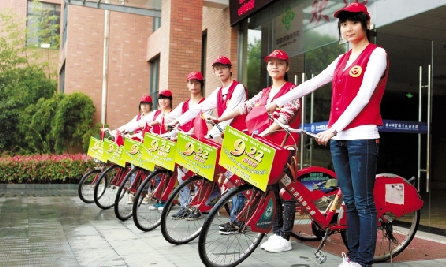 9月22日,是杭州第六个“无车日”,浙江经贸职业技术学院党校志愿者身穿红色马甲,骑着公共自行车穿梭在下沙的大街小巷,开展“世界无车日”公益宣传活动。