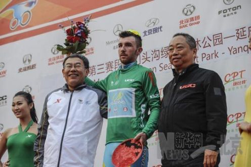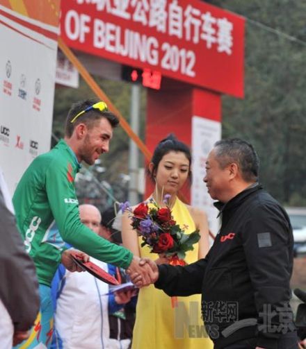 UCC环球自行车工业有限公司董事长林庆熙为环京赛第三赛段冠军加瓦齐颁发“冲刺王”绿衫。