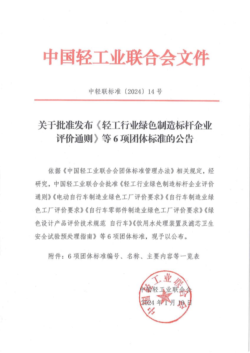 关于批准发布《轻工行业绿色制造标杆企业评价通则》等6项团体标准的公告