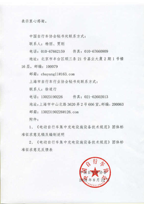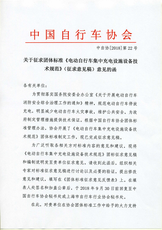 关于征求团体标准《电动自行车集中充电设施设备技术规范》(征求意见稿)意见的函 来源:中自协 作者:文化技术部 发布时间:2018-08-27 13:43 如有单位需要了解标准的具体内容并发表意见的,可向taptapios官网下载秘书处索取资料。 附件1:团体标准《电动自行车集中充电设施设备技术规范》编制说明.docx 附件2:《电动自行车集中充电设施设备技术规范》团体标准征求意见反馈表.docx 摘编:admin888; 摘编日期:2018年8月27日