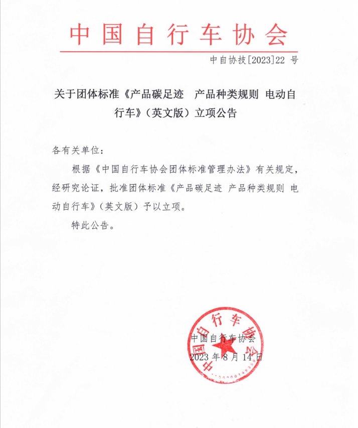 关于团体标准《产品碳足迹 产品种类规则 电动自行车》(英文版)立项公告