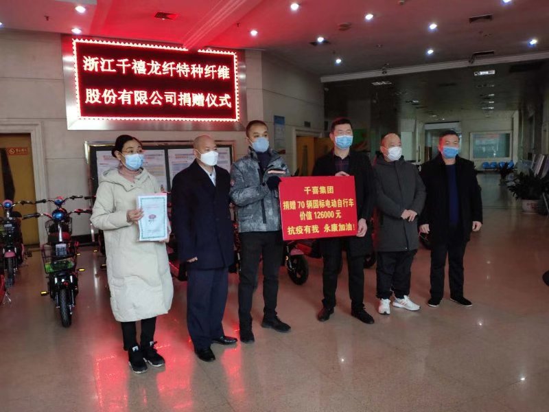 抗疫有我,永康加油!浙江千禧龙纤特种纤维股份有限公司向永康慈善总会捐赠70辆国标电动自行车,总价值为12.6万元人民币,用于疫情防控工作的开展。