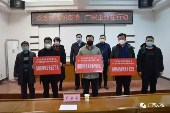 2月10日,河北万达轮胎有限责任公司向广宗县红十字会捐款50万元。邢台市第十五届人大代表、广宗县第十六届人大代表、河北万达轮胎有限责任公司总经理孙士健,个人向广宗全县奋战在一线的防疫工作人员捐1万只口罩,用于抗击疫情。