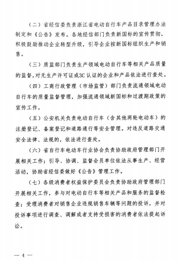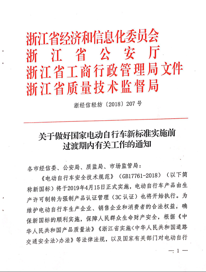《电动自行车安全技术规范》(GB17761-2018)(以下简称新国标)将于2019年4月15日正式实施,电动自行车产品由生产许可制转为强制产品认证管理(3C认证)也已开始执行。为维护电动自行车生产企业、销售企业和消费者的合法权益,确保新国标的顺利实施,保障人民群众生命财产安全,根据《中华人民共和国产品质量法》、《浙江省实施<中华人民共和国道路交通安全法>办法》等法律法规,以及国家有关部门对电动自行车实施新国标和3C认证制度的要求,结合浙江省实际情况,浙江省经济和信息化委员会、浙江省公安厅、浙江省工商行政管理局、浙江省质量技术监督局等部门近日联合出台《关于做好国家电动自行车新标准实施前过渡期内有关工作的通知》的文件,就做好新国标实施前过渡期内电动自行车生产、销售、产品公告、登记上路等方面工作作了部署: