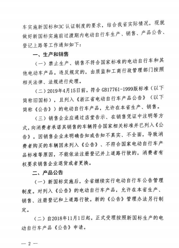 (二)2019年4月15日前,符合GB17761-1999版标准(以下简称旧国标),且列入《浙江省电动自行车产品公告》(以下简称《公告》)的电动自行车产品,允许在本省生产、销售。