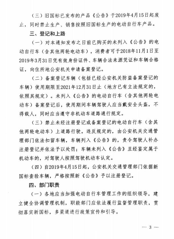 (一)新国标实施后,全省继续实行电动自行车公告管理制度。对列入《公告》的电动自行车产品,允许在本省生产、销售、注册登记和上道路行驶。新的《公告》管理办法另行制定。