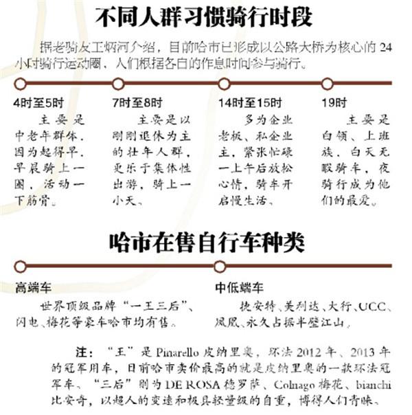 对于上班族姚女士来说,一台汽车16.8万元,她不舍得买,一台自行车16.8万元,她痛快地扛回家,这就是骑行的魔力。据市自行车运动协会统计,目前哈市加入骑行运动的人群已经从2008年的2000人发展到6万余人,从前年起,骑行“发烧友”人群更是以每年2万的速度递增,全市骑行俱乐部、骑行群组数量破百。目前,哈市已形成24小时骑行圈,每天一群群骑行人穿梭在乡野街头。