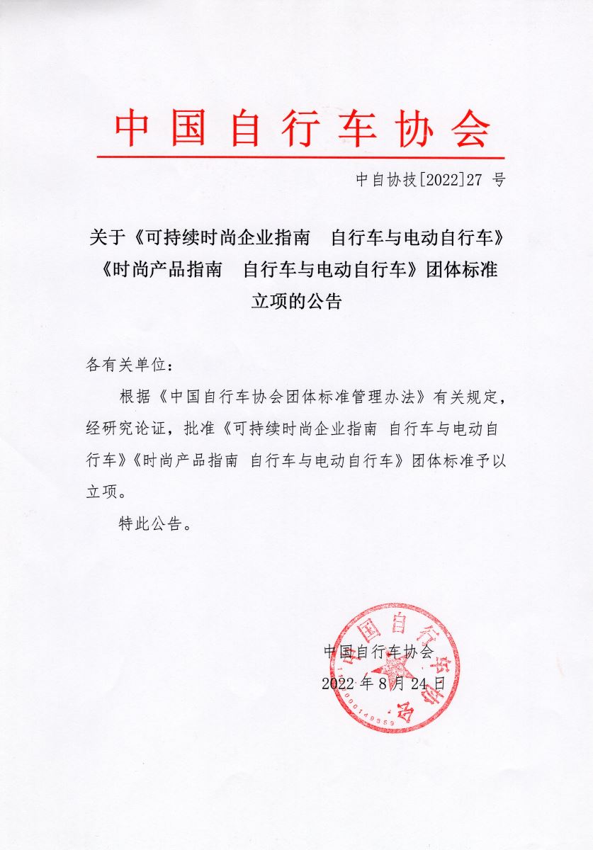 关于《可持续时尚企业指南 自行车与电动自行车》《时尚产品指南 自行车与电动自行车》团体标准立项的公告