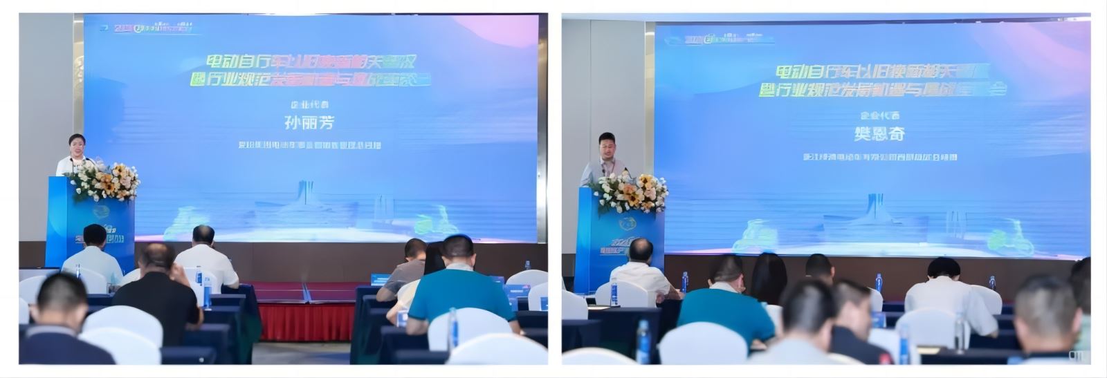 随后,爱玛集团电动车事业部销售管理总经理孙丽芳和绿源集团品牌市场总监樊恩奇也分别分享了各自企业在电动自行车以旧换新政策规范发展的实践经验和相关建议。