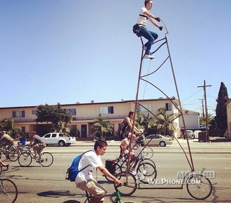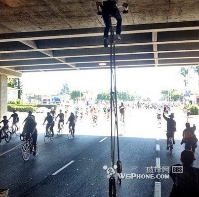 这位达人带着这辆奇葩自行车于上周日 (当地时间) 参加了洛杉矶的 CicLAvia (自行车与步行日活动),行驶过程中赢得了不少旁观者的欢呼。从视频中我们可以看,这辆高耸的自行车骑起来似乎并不平稳,偶尔摇晃的画面不禁让人担心设计者行车过程的安全问题。