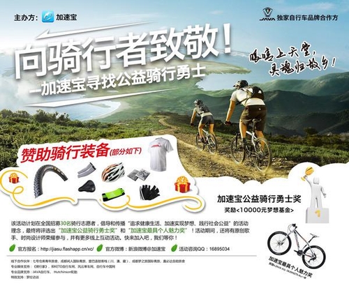 近日,一场主题为向骑行者致敬!加速宝寻找公益骑行勇士的大型公益活动在骑行圈内悄然蔓延,据悉,这是一场由移动应用加速宝发起,JAVA自行车品牌独家赞助的活动。这次活动旨在围绕追求健康生活、加速实现梦想、践行社会公益的活动理念,通过骑行志愿者的社交分享和环保行动,来传播更多的社会正能量,唤醒大家的环保意识。
